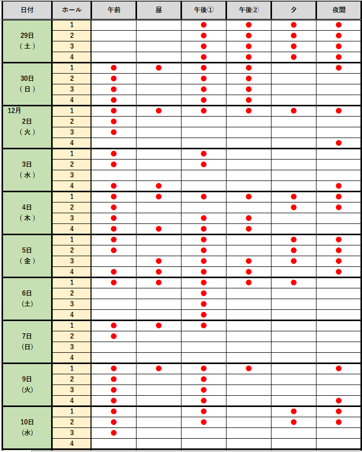 11月29日~12月10日 空き状況
